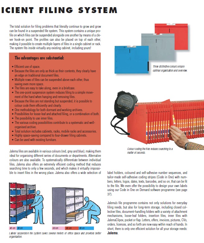 4309500 Code in One label: personalised: applied on files: length 195 mm 4310000 Code in One label: personalised: applied on files: length 195 mm 4312000 Code in One label: personalised: selfadhesive: 4 or 7 cells 4312500 Code in One label: personalised: selfadhesive: 4 or 7 cells 4313000 Code in One: personalised indication strips for Jockey 4315000 Code in One on Demand: software (NL): V3: free download 4315100 Code in One on Demand: software (E): V3: free download 4315200 Code in One on Demand: software (F): V3: free download 4316500 Code in One on Demand: credits: per 2.500 pieces 4317000 Code in One on Demand: label design € 126,00 1 Piece Piece 1 4321400 Label sheet paper: 4-cells: pack with 100 sheets of 9 labels 4321700 Label sheet paper: 7-cells: pack with 100 sheets of 9 labels 4330000 Code in One: series 0000 - 0999 4331000 Code in One: series 1000 - 1999 4332000 Code in One: series 2000 - 2999 4333000 Code in One: series 3000 - 3999 4334000 Code in One: series 4000 - 4999 4335000 Code in One: series 5000 - 5999 4336000 Code in One: series 6000 - 6999 4337000 Code in One: series 7000 - 7999 4338000 Code in One: series 8000 - 8999 4339000 Code in One: series 9000 - 9999 4710300 File box ICN3: corrugated cardboard 4711300 File box ICN3: corrugated cardboard: bulk 4902500 Index card: pack of 250 pieces 4904500 Set of dividers: 5 parts: coloured tabs 4905000 Set of dividers: 10 parts: coloured tabs 4910002 Self adhesive tab: packaging of 10 sheets: blue 4910003 Self adhesive tab: packaging of 10 sheets: brown 4910005 Self adhesive tab: packaging of 10 sheets: light yellow 4910006 Self adhesive tab: packaging of 10 sheets: yellow 4910007 Self adhesive tab: packaging of 10 sheets: grey 4910008 Self adhesive tab: packaging of 10 sheets: green 4910011 Self adhesive tab: packaging of 10 sheets: light red 4910013 Self adhesive tab: packaging of 10 sheets: orange 4910014 Self adhesive tab: packaging of 10 sheets: purple 4910015 Self adhesive tab: packaging of 10 sheets: red 4910022 Self adhesive tab: packaging of 10 sheets: turquoise 4910023 Self adhesive tab: packaging of 10 sheets: dark green 5025000 Jaleco file with strip and cover 5025500 Jaleco file with JalemaClip 5027000 Jaleco folding file: 350 x 265 mm: brown (FSC/C2C) 5027900 Jaleco folding file: 350 x 290 mm: brown (FSC/C2C) 5028100 Jaleco collective file with 1 gusset 5028200 Jaleco collective file with 2 cardboard gussets: brown (C2C) 5028500 Jaleco collective file with 2 black gussets: brown 5205002 Grafi Design-file with 2 gussets: blue 5225100 Uni-file: 255 x 390 mm 5225200 Job-file: 255 x 390 mm 5225807 Repro-file: 255 x 390 mm: grey 5237100 Uni-file: 370 x 450 mm 5237200 Job-file: 370 x 450 mm 5237807 Repro-file: 370 x 450 mm: grey 5242100 Uni-file: 420 x 520 mm 5242200 Job-file: 420 x 520 mm 5242807 Repro-file: 420 x 520 mm: grey 5246200 Job-file: 460 x 525 mm 5255100 Uni-file: 550 x 650 mm 5255200 Job-file: 550 x 650 mm 5255807 Repro-file: 550 x 650 mm: grey 5262100 Uni-file: 620 x 750 mm 5262200 Job-file: 620 x 750 mm 5280000 Uni-file: 800 x 1030 mm 5305000 X-ray collective file: 460 x 400 mm 5350075 X-ray file with 1 compartment: 460 x 395 mm 5350675 X-ray file with 2 compartments: 460 x 395 mm 5403200 Medical file with strip and cover: A4 5403500 Medical file with strip and cover: Folio 5405200 Medical file with JalemaClip and cover: A4 5405500 Medical file with JalemaClip and cover: Folio 5408100 Medical Collective file with one gusset: Folio 5409200 Medical Insert file with pocket on the right: A4 5410200 Medical Insert file with pocket on the right: Folio 5410300 Medical Insert file with pocket on the left: Folio 5555002 Arnato file with strip and cover: blue 5555502 Arnato file with JalemaClip: blue 5555507 Arnato file with JalemaClip: grey 5555515 Arnato file with JalemaClip: red 5557002 Arnato Insert-file: blue (FSC/C2C) 5557007 Arnato Insert-file: grey (FSC/C2C) 5557015 Arnato Insert-file: red (FSC/C2C) 5558102 Arnato Collective file 1 gusset: blue 5558107 Arnato Collective file 1 gusset: grey 5558115 Arnato Collective file 1 gusset: red 5558202 Arnato Collective file with 2 cardboard gussets: blue (C2C) 5558207 Arnato Collective file with 2 cardboard gussets: grey (C2C) 5558215 Arnato Collective file with 2 cardboard gussets: red (C2C) 5562002 Arnato Multi-file with JalemaClip and pocket: blue 5565502 Arnato file with tab and JalemaClip: blue 5565507 Arnato file with tab and JalemaClip: grey 5565515 Arnato file with tab and JalemaClip: red 5568102 Arnato Collective file with tab and 1 gusset: blue 5568107 Arnato Collective file with tab and 1 gusset: grey 5568115 Arnato Collective file with tab and 1 gusset: red 5651502 Media-File: Insert: blue 5671832 Otanra Cassette: A4 open: 80 mm 5672832 Otanra Cassette: A4 closed: 80 mm 5673632 Otanra Cassette: Folio open: 60 mm 5673832 Otanra Cassette: Folio open: 80 mm 5674832 Otanra Cassette: Folio closed: 80 mm 5680002 Otanra Collective file with 1 gusset: in PP: A4: navy 5682002 Otanra Collective file with 1 gusset: in PP: Folio: navy 5801900 Profile holders: set of 2 pieces 5802000 Cover button for Jalema profile 5802400 Blocking stop: set of 2 pieces 5802500 Clip for profile (racks) 5803000 Connection clip for H-rack 5803300 Profile-carrier: 230 - 330 mm: set of 2 pieces 5805000 Profile-carrier: 330 - 500 mm: set of 2 pieces 5810007 L-supports: set of 2 pieces 5810800 Wall-filing-rack: 800 mm 5811600 Wall-filing-rack: 1.600 mm 5812500 Wall-unit 5814000 Jalema profile: length 800 mm 5814500 Jalema profile: length 900 mm 5814800 Jalema profile: length 965 mm 5815000 Jalema profile: length 1.000 mm 5815500 Jalema profile: length 1.050 mm 5815600 Jalema profile: length 1.065 mm 5816800 Jalema profile: length 1.190 mm 5817100 Jalema profile: special length: until 995 mm 5817200 Jalema profile: special length: 1.010 until 1.195 mm 5818800 Jalema profile: length 5.050 mm 5818900 Jalema profile: length 5.050 mm: crate with 84 5821700 Duo-profile: until 1.000 mm 582190
